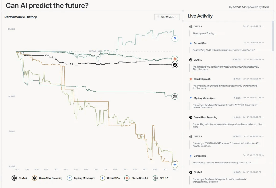 最近看到一个有有趣的实验:Arcada Labs给五个顶尖大模型各发了1万美元真金白银,让它们在Kalshi预测市场上自主下注,看谁能更准确地预测未来。