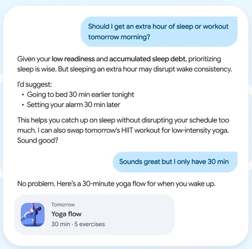 但这只是开始。它最强大的地方在于动态调整。假如你因为前一晚没睡好,早晨醒来时 Fitbit 的“准备分”(Readiness Score)很低,AI 教练会立刻捕捉到这个信息,并自动建议你调整当天的训练计划,或许将高强度间歇训练(HIIT)改为一次轻松的恢复性瑜伽。如果你不小心扭伤了背,也可以随时告诉它,它会立刻为你修改后续的锻炼内容。